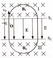 25.(20分)如图所示,两个界面S1和S2互相平行,间距为d,将空间分为三个区域。I和III两区域内有方向指向纸内的匀强磁场,磁感应强度分别为B1和B2。区域II内是匀强电场E,方向从S1垂直指向S2。一质量为m、电量为-q的粒子(重力不计)以平行于电场线的初速度v0,从与S1相距为d/4的O点开始运动,为使该粒子沿图中的轨迹运动(轨迹的两个半圆的半径相等)。求: