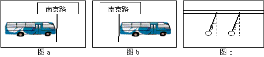 如图中a、b所示,是一辆质量m=6×103kg的公共汽车在t=0和t=4s末两个时刻的两张照片。当t=0时,汽车刚启动(汽车的运动可看成匀加速直线运动).图c是车内横杆上悬挂的拉手环经放大后的图像,测得θ=300.根据题中提供的信息,无法估算出的物理量是 ( )