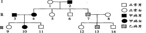 (3)若Ⅲ一10和Ⅲ一13结婚,生育的孩子患乙病的概率是 ,若Ⅱ一7和Ⅱ一8再生下一个男孩,这个男孩患乙病的概率是 。