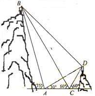 (满分10分)如图,A,B,C,D都在同一个与水平面垂直的平面内,B,D为两岛上的两座灯塔的塔顶。测量船于水面A处测得B点和D点的仰角分别为