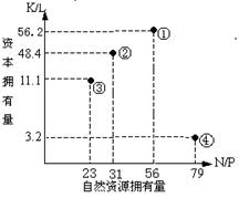 资本拥有量和自然资源拥有量是反映一个国家国情的基本数据。其中资本拥有量(K/L)=资本/劳动力,自然资源拥有量(N/P)=自然资源量/10万人口·km2。下图反映的是中.日.韩.德四国的国情资料,据此回答25-26题。