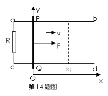 14.如图所示,固定于水平面的U型金属导轨abcd,电阻不计,导轨间距L=1.0m,左端接有电阻R=2Ω。金属杆PQ的质量m=0.2kg,电阻r=1Ω,与导轨间动摩擦因数μ=0.2,滑动时保持与导轨垂直。在水平面上建立xoy坐标系,x≥0,的空间存在竖直向下的磁场,磁感应强度仅随横坐标x变化。金属杆受水平恒力F=2.4N的作用,从坐标原点开始以初速度v0=1.0m/s向右作匀加速运动,经t1=0.4s到达x1=0.8m处,g取10m/s2。求: