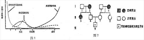 27.(8分)下图1表示各类遗传病在人体不同发育阶段的发病风险。图2表示某单基因遗传病的一个家系,其中Ⅰ-4为纯合子。请据图回答: