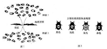 (6分)下图1显示了某种甲虫的两个种群基因库的动态变化过程。种群中每只甲虫都有相应的基因型,A和a这对等位基因没有显隐性关系,共同决定甲虫的体色,甲虫体色的基因型和表现型如图2所示。请据图回答: