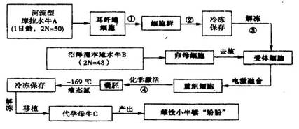 34.(8分)广西省水牛研究所科研人员利用克隆胚胎冷冻技术,使一头杂交母水牛顺利产下一头冷冻胚胎移植的体细胞克隆雌性水牛犊,取名“盼盼”,它的出生经历了一个严密复杂的科学操作过程(如下图所示):