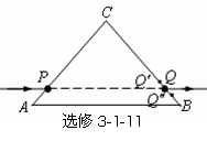 一个等腰直角三棱镜的截面如图3-1-11所示,一细束绿光从AC面的P点沿平行底面AB方向射入棱镜后,经AB面反射,再从BC面的Q点射出,且有PQ∥AB(图中未画光在棱镜内的光路).如果将一细束蓝光沿同样的路径从P点射入三棱镜,则从BC面射出的光线是( )