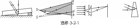 ②设法将同一束光分为两束(这样两束光都来源于同一个光源,因此频率必然相等)。如图3-2-1中4个图分别是利用双缝、利用楔形薄膜、利用空气膜、利用平面镜形成相干光源的示意图。