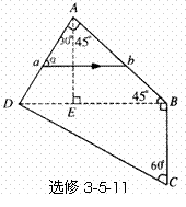 15.玻璃棱镜ABCD可以看成是由如图3-5-11所示的ADE、ABE、BCD三个直角三棱镜组成,一束从AD面人射的光线在棱镜中的折射光线ab与AD面的夹角α=60°,已知光在真空的速度c=3×l08m/s, 玻璃的折射率n=1.5.求: