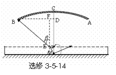 有一台发出细光束的激光器装在小转台M上,转台以恒定的角速度转动,使激光束在竖直平面内扫描,小转台M位于液体池的底部,池的深度为 3m,宽度足够大,如图3-5-14所示。在小转台M的正上方,有固定在竖直平面内的圆弧形显示屏,圆心位于小转台M处,圆弧的圆心角为120°,半径为R=10m,C点是圆弧AB的中点,C与 M的连线位于竖直线上。池中没有液体时,激光束从A扫描到B所需的最短时间t1=2s ,当池中装满某种液体时,激光束从A扫描到B所需的最短时间t2=1s,求液体的折射率。