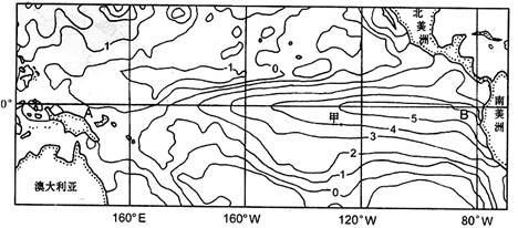 下图为“厄尔尼诺发生时太平洋表层水温异常现象示意图”。 图中等值线为太平洋海域表面水温正距平(℃)。读图回答2-3题。