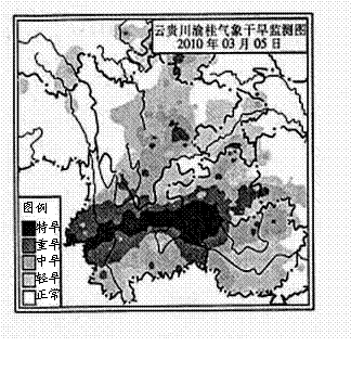 2009年秋季以来,我国西南地区降雨少、来水少、蓄水少、气温高、蒸发大、墒情差,致使广西、重庆、四川、贵州、云南5省(自治区、直辖市)遭受旱灾。读“云贵川渝桂气象干旱监测图”,回答5-6题。