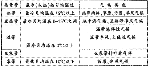 (2)以温定带--根据最冷月或最热月均温值(指北半球),确定热量带。