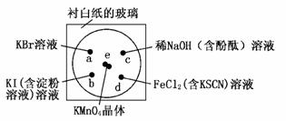19.化学实验的微型化可有效地减少污染,实现化学实验绿色化的要求。某学生按下列操作做一个实验:在一块下衬白纸的玻璃片的不同位置分别滴加浓度为0.1 mol·L-1的KBr、KI(含淀粉溶液)、NaOH(含酚酞)、FeCl2(含KSCN)溶液各1滴,每种液滴彼此分开,围成半径小于表面皿的圆形(如图所示),在圆心处放置2粒芝麻粒大小的KMnO4晶体,向KMnO4晶体滴加一滴浓盐酸,再立即将表面皿盖好。(已知2KMnO4+16HCl(浓)===2KCl+2MnCl2+5Cl2↑+8H2O)