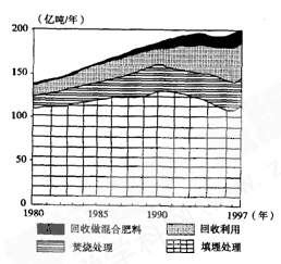 读某国20世纪后期固体废弃物产生总量及处理构成变化图,完成26-27题。