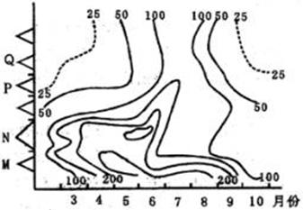 图3所示是我国东经110°以东地区的月等降水量线分布状况,M、N、P、Q分别代表不同纬度带的四个地区,根据图中提供的信息,完成23-24题: