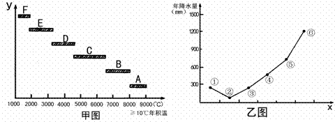 某研究人员依据我国多年平均气候资料,按一定方向分别选取了A→F和①→⑥共12个地区,分类绘成图15中的甲、乙两图。读图完成14-15题。(双选)