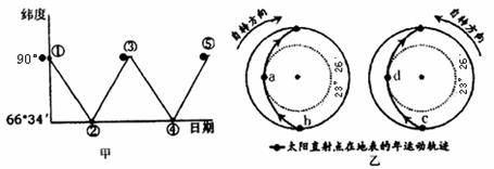 6.晨昏圈与北半球纬线圈相切于某一点,甲图是该点纬度的年变化示意图。该点的纬度变化与下列现象相对应的是