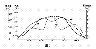 雪线高度是指终年积雪下限的海拔。下图表示全球不同纬度多年平均雪线高度、气温、降水量的分布。读图,回答5-7题。