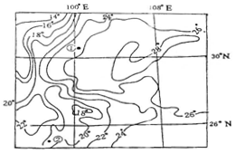 读下图“我国西南部分地区7月等温线分布图”,回答12一16题。