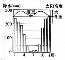 下图为某地降水年内分配和正午太阳高度年变化示意图,读图回答5-6题。
