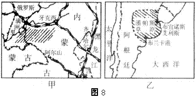 读我国内蒙古呼伦贝尔牧区(甲)和阿根廷潘帕斯牧区(乙)分布示意图,回答20-22题。