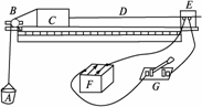 如图3-4-7所示,是某次利用气垫导轨探究加速度与力、质量关系的实验装置安装完毕后的示意图,图中A为砂桶和砂,B为定滑轮,C为滑块及上面添加的砝码,D为纸带,E为电火花计时器,F为蓄电池、电压为6 V,G是电键,请指出图中的三处错误:
