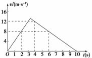 解析:仔细观察数据可得, 0-2 s内物体加速运动,加速度a1=4 m/s2,2-4 s内也是加速运动,但按照0-2 s规律,4 s末应加至16 m/s,所以在4 s末物体应处于水平段,4-6 s内物体的运动为水平方向的匀减速运动,加速度a2=2 m/s2.因题目设计的数据较小且规律性明显,可作速度时间图象如图.由图知物体在3-4 s内达到最大速度,大于12 m/s,A、B均错;在t=10 s时到达C点静止,C对;A、B间距离应小于B、C间距离,D错.若采用公式法,虽可解出,但计算量大,解得t=10/3 s时到达B点,速度为40/3 m/s.