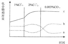(3)(每空2分)在光照条件下,向培养小球藻的试管中通入用14C标记的浓度为1%的14CO2,第5分钟再通入浓度为2%的14CO2,第10分钟再供给浓度为0.003%的14CO25分钟,并维持各时间段内相应的二氧化碳浓度。在这个过程中,分别检测小球藻内的葡萄糖、三碳化合物、五碳化合物的放射强度,得到上图中a、b、c三条曲线。这三条曲线表示的化合物依次是 、