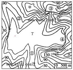 5.在一次较大的降水过程中,降落在④地的水体在坡面上的流向是 ( )