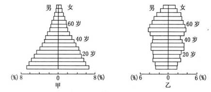 下图为“甲、乙两国人口年龄结构金字塔图”。图中分别反映了两国不同性别、不同年龄阶段的人口占总人口的百分比。读图完成11-12题。