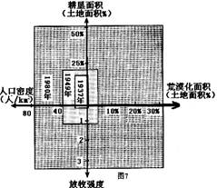 读1937-1980年内蒙古商都县土地耕垦、人口、放牧强度和荒漠化面积发展变化图,回答7-8题。
