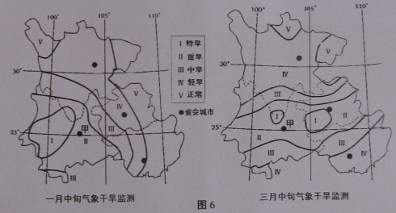 材料一 2010年1月中旬和3月中旬我国某区域干旱等级分布图。