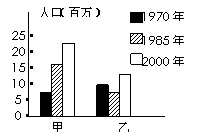 下面为甲、乙两城市人口增长图,分别代表了两种不同类型的国家。据此回答14-15题。
