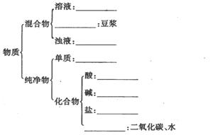 (8分)现有下列物质:A.豆浆,B.食盐水,C.铁,D.硫酸,E.氢氧化钠固体,F.纯碱,G.泥水,H.二氧化碳,I.水。请将它们的序号或所属类别填充到下列横线上。