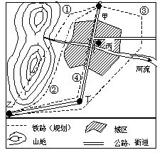 15、该市规划修建从甲到乙的铁路线,从造价、路程、环境等方面考虑,在①、②、③、④四条待选线路中,你认为较合理的是