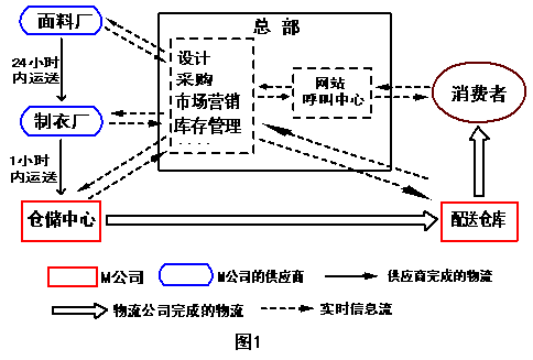 北京的王女士登录总部位于上海的M公司(服装公司)网站,订购了两件衬衣,两天后在家收到货。图1示意M公司的企业组织、经营网络。据此完成22-23题。