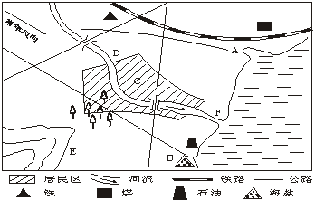 28、某工业城市拟在适当的位置新建化工厂、自来水厂、钢铁厂、水泥厂,请根据影响工业区位的主要因素,同时考虑对环境的保护,选择合适的区位,布局相关企业。(12分)