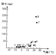 下图是某地气温降水月份分配示意图,图中数字表示月份,据此回答22-23题。