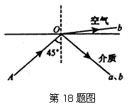 18.由a、b两种单色光组成的细光束AO以45°的入射角从某种介质射向空气时,光路如图所示。关于这两种单色光,下列说法中正确的是 ( )