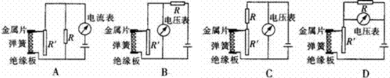 7. 小明同学在物理实践活动中,设计了如图所示的四种用电流表或电压表示数反映弹簧所受压力大小的电路,图中R′是滑动变阻器,R是定值电阻,电源两极间电压恒定.四个电路中有一个电路能实现压力增大,电表示数增大,这个电路是( ).