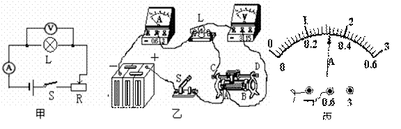 (2).小明同学按照自己的想法改接了一根导线,闭合开关后发现灯泡发光较暗,电流表和电压表均有示数.任意移动滑片,电压表示数始终不变,具体原因是 。.(3).小明改正错误后,当变阻器的滑片移到某位置时,电压表的示数为6V,电流表的示数如图丙所示,则小灯泡的额定电流为 A,额定功率为 W。.