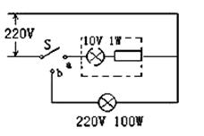 22.黑夜看不见开关位置,为此小明设计了如图所示的电路。.当单刀双掷开关S合向b时,照明灯亮、指示灯灭,避免指示灯费电;S合向a时,照明灯灭、指示灯亮,显示开关位置(S只能处于这两种状态).。.他在图示方框中完成指示灯和电阻丝的连接电路,指示灯规格 为“10V,1W”,照明灯规格为“220V,100W”