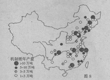 读下图“中国造纸工业分布示意图”(图8),回答18-19题。