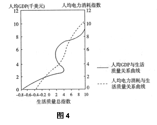 “生活质量”是经济、社会和生态等因素共同影响的结果。图4为生活质量与GDP和电力消耗量关系示意图。读图回答8-9题。