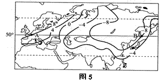 图5是亚欧大陆气温等距平线略图.气温距平值是指该地气温与同纬度平均气温的差值。下图中,A、B两地(图中黑点)分别位于不同等距平线上。据此回答10-11题。