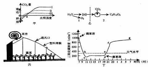 26、(18分)下列图示中甲、乙显示植物光合作用与光照强度之间的关系和相关生理过程;丙、丁表示种植蔬菜的大棚剖面图(棚顶的草席是用草制成的覆盖物)和一天中大棚内CO2浓度变化的曲线,其中在c~d期间打开大棚通风口。请根据图中信息回答: