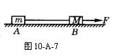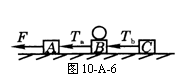 3.如图10-A-7所示,置于水平地面上的相同材料的质量分别为m和M的两物体A和B用细绳连接,在B上施加一水平恒力F,两物体做匀加速直线运动.关于两物体间细绳上的拉力,正确的说法是 ( ).