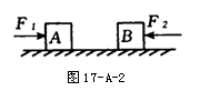 如图17-A-2所示,F1、F2等大反向,同时作用在静止于光滑水平面上的A、B两物体上,已知MA>MB,经过相等时间撤去两力,以后两物体粘为一体,这时A、B将 ( )