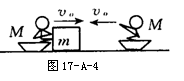 30 kg,乙和他的冰车总质量也是30 kg,游戏时,甲推着一个质量m=15 kg的箱子,和他一起以大小为V0=2m/s的速度滑行,乙以同样大小的速度迎面滑来,(如图17-A-4)为了避免相撞,甲突然将箱子沿冰面推给乙,箱子滑到乙处时乙迅速把它抓住,若不计冰面的摩擦,问甲至少要以多大的速度(相对地面)将箱子推出,才能避免与乙相撞.(注意两人避免相撞的条件)