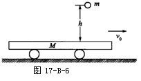 如图17-B-6所示,质量为M的平板车在光滑水平面上以速度v匀速运动,车身足够长,其上表面粗糙,质量为m的小球自高h处由静止下落,与平板车碰撞后,每次上升高度仍为h,每次碰撞过程中,由于摩擦力的冲量不能忽略,小球水平速度逐渐增大,撞击若干次后,小球水平速度不再增大,则平板车的最终速度V是多大?